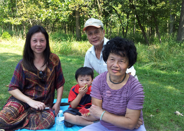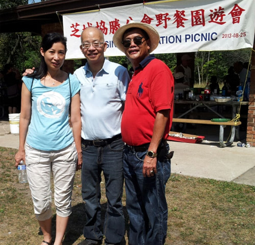 芝城協胜公會8月25日的野餐聯誼,當天,風和日麗,清風送爽,場地舒雅,綠草如茵,環境優美,有廣大的停車場,寬敞闊大,四面通風的亭台,自成一國,背著森林保護區的蒼天松木,鳥語花香,景色怡人,久不久時,也見野生動物,無拘無束的隨意亂跑,忽然,一大一小的梅花鹿,也來趁熱鬧,走近人群,是挺可愛的,舔著舌頭討嘢食,引起到會大小朋友們的圍觀,譁笑欣賞。芝城唐人社區著名的攝影師們,也來趁這機會,帶著年青貌美,活力四射的華籍模特兒們,在這裡找景拍照呢!