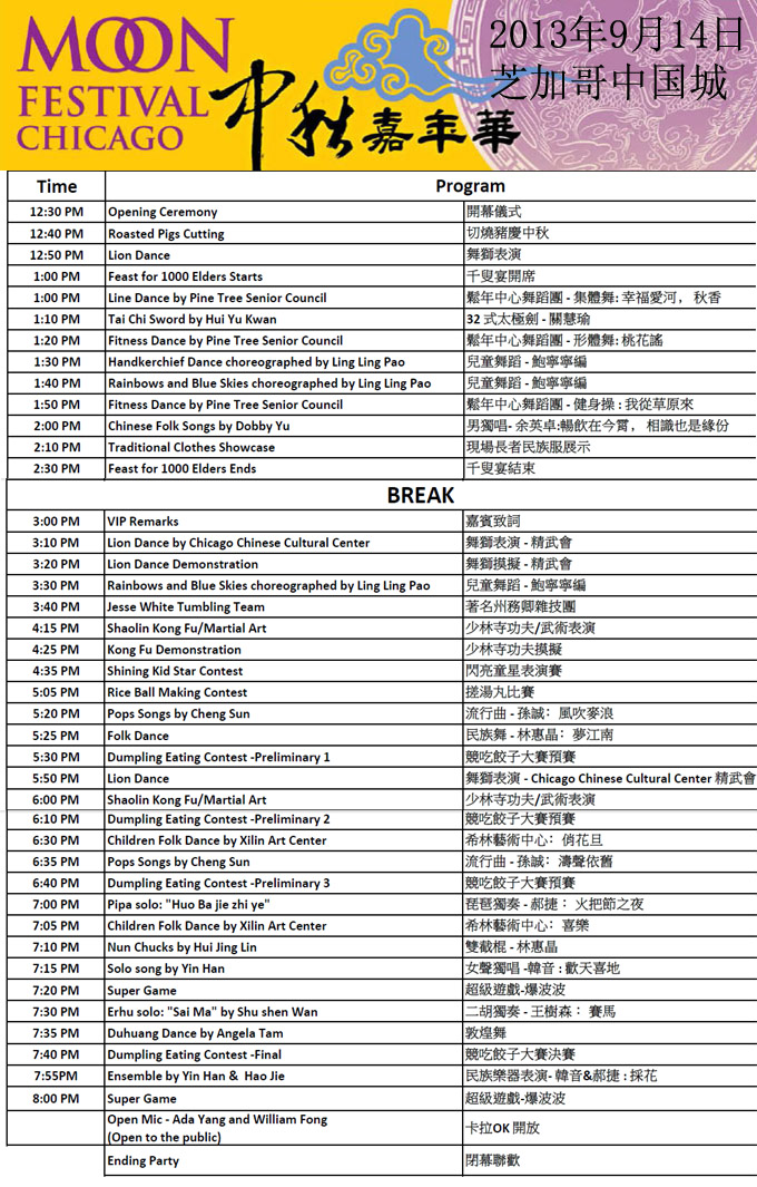 12:30 pm - 8 pm)在中国城十二生肖广场(Chinatown Square)主办2013"芝加哥中秋嘉年华 ”。为促进芝加哥地区摄影爱好者的交流与联谊,东方协会协会特组织“中秋嘉年华有奖抓拍”活动,以特别方式的欢度中秋,繁荣华人社区文化生活。