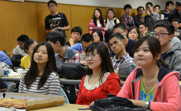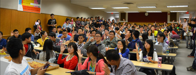 西北大学位于芝加哥北郊艾文斯顿镇(Evanston, IL),校区毗邻密西根湖,校园内林木参天,风景秀丽,人文艺术氛围浓郁。在这个秋高气爽的日子,即将开始全新生活的留学生们,齐聚在西北大学“科技大楼”,听学哥学姐们介绍西北大学的校园生活。学生会还特别为本次活动准备披萨、饮料,让新生们宾至如归。
