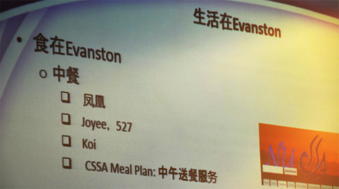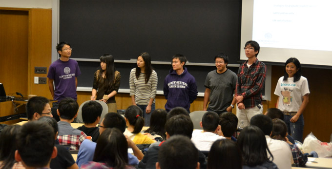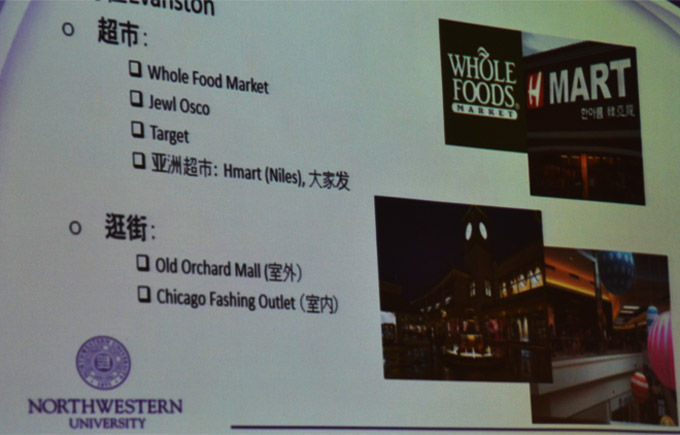 迎新活动由西北大学学生会副主席吕智主持,主席薄振宇首先代表学生会对新生的到来表示热烈欢迎。发表“生活在Evanston”专题演讲。 专题演讲设计新生报到、领取交通卡(U Pass)、学生卡(Wildcard),办理手机,银行开户等开始留学新生活的必备要点。
