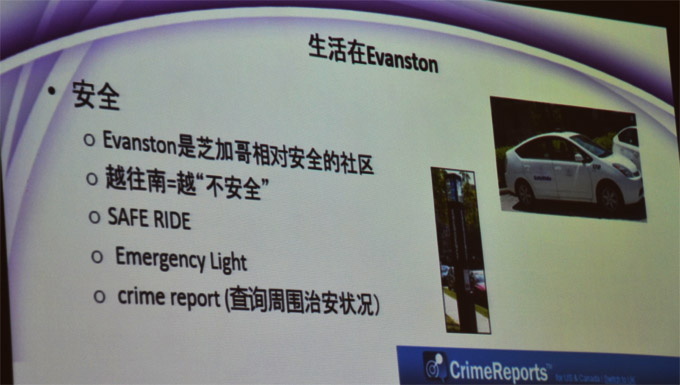 留学在外,首先要注意的就是平安,确保人身安全。薄振宇在演讲中特别向新生们讲解了相关治安尝试:西北大学校方为本校学生提供“安全接送服务”(Safe Ride),这是校方免费服务,不过需要提前预约。如果遇到紧急情况,西北大学校园内都有蓝灯柱(Emergency Light),当事人只要按下蓝灯按钮,校警就会及时赶到现场协助。新生今后如果要到校外租房,可上网查看crime report, 避免抢劫、入室盗窃频发的社区。在Evanston 与芝加哥市交界区域,治安往往不佳,新生们出行要保持一定的防范意识。