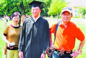 59岁的华人俞恬声(右一)和夫人参加25岁的儿子俞金成(中)的毕业典礼。今年4月,俞恬声在停车时无故被两名非洲裔少年打死,儿子受重伤。