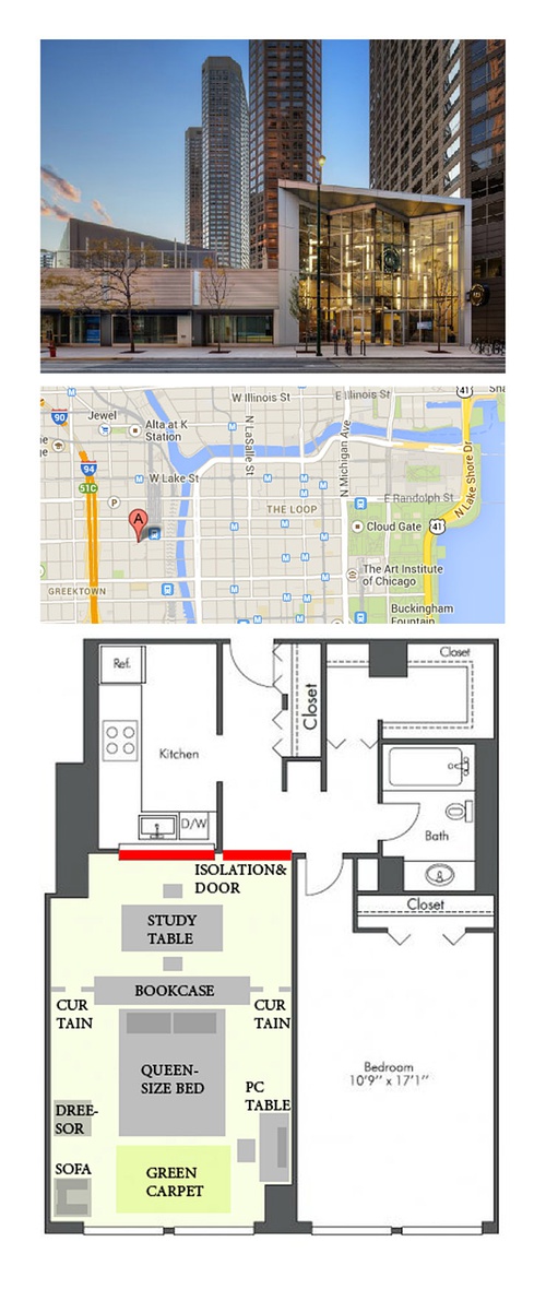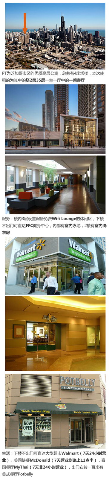 PT为芝加哥市区的优质高层公寓,总共有4座塔楼,本次转租的为其中的塔2第35层一室一厅中的一间客厅