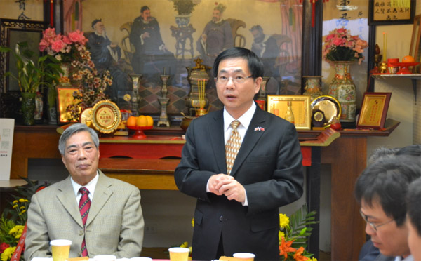 1月2日是台北经文处新年团拜第二天,葛葆萱处长、曾伟明副处长,侨教中心主席阎树荣、副主任林珖舞等一行,顶风冒雪,马不停蹄,先后拜访了昭伦公所、伍胥山公所、余风采堂、遡源公所、梅氏总公所、黄氏宗亲会、龙冈亲义公所、至德三德公所、李氏公所。