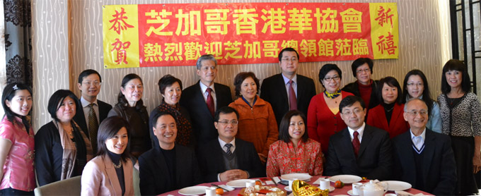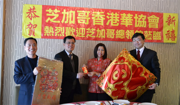 总领事新春团拜顶风冒雪,南北奔波,车马劳顿,香港华协会当天特别在名轩举行午宴,欢迎总领事一行。香港华协会永远会长李德明、前会长朱庆龙、现任会长郑品端,以及黎斌雄、陆张意颜等董事成员,与总领事一行欢聚一堂,共进午餐,气氛热闹温馨。当天,总领事一行还拜访了芝城黄氏宗亲会、遡源公所、华咨处、广州协会等社团机构。(图文: