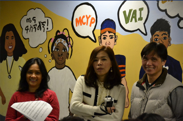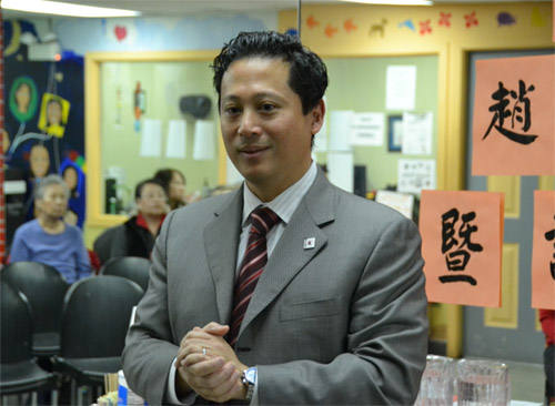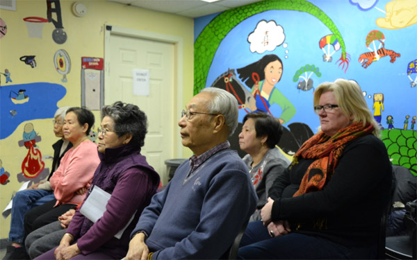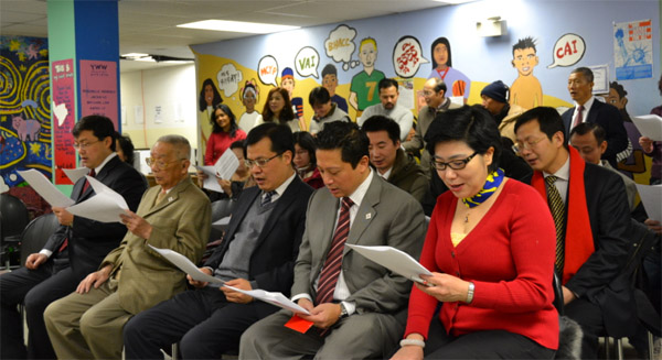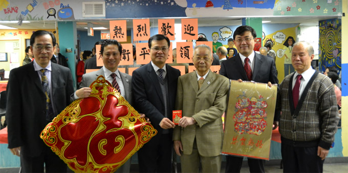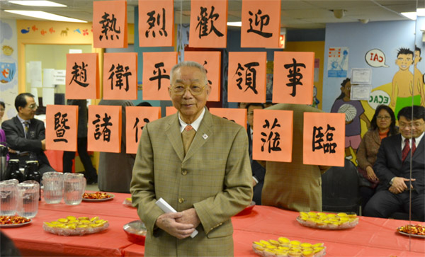 团拜当天,大雪纷飞,总领事一行北华埠首访华人互助会。华人互助会创办人黄怀德、行政主任曼德洛(Dennis J. Mondero)、华人互助会耆英俱乐部黄仲山等职员,一大早恭候总领事一行的光临。在黄怀德、曼德洛的陪同下,赵卫平总领事参观了华人互助会各项服务,并同当天正在补习英文的各族裔新移民们亲切交谈。互助会耆英俱乐部的老人家,当天热烈欢迎总领事一行的到来,并同总领事一起唱起《友谊圆舞曲》等欢快歌谣。