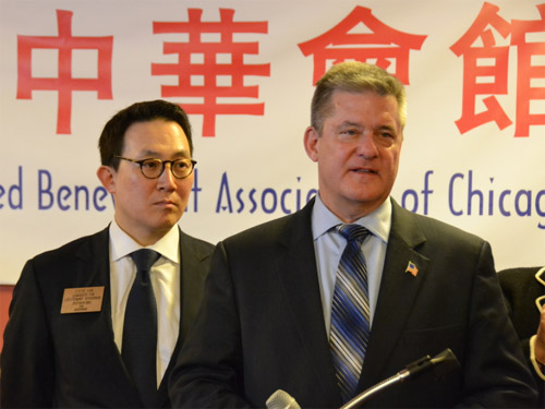 共和党派州长候选人、伊州现任财长 Dan Rutherford(右),与竞选搭档、韩裔斯蒂夫金(左)拜访中华会馆