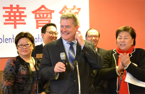 Dan Rutherford 用中文向大家问好,右一为积极参与主流政治的侨领梅施美瑛