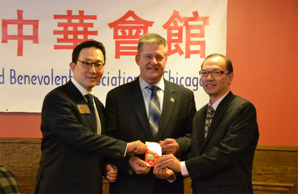 芝加哥侨学网报道】伊州州长的共和党派候选人、伊州现任财长卢瑟福(Dan Rutherford)1月25日来到芝城中华会馆拜票。卢瑟福和韩裔竞选搭档斯蒂夫金,向中华会馆赠送新春吉祥红包,并呼吁华裔选民在今年3月的初选中投票支持。卢瑟福财长拜访中华会馆,是由芝加哥地区知名侨领梅施美瑛积极协助,支持共和党的侨领梅施美瑛曾当选2012全美共和党代表大会伊州候补党代表。卢瑟福、斯蒂夫金在中华会馆主席刘国新及梅施美瑛的陪同下,向正在中华会馆享受午餐的华裔老人家表示问候。