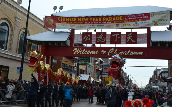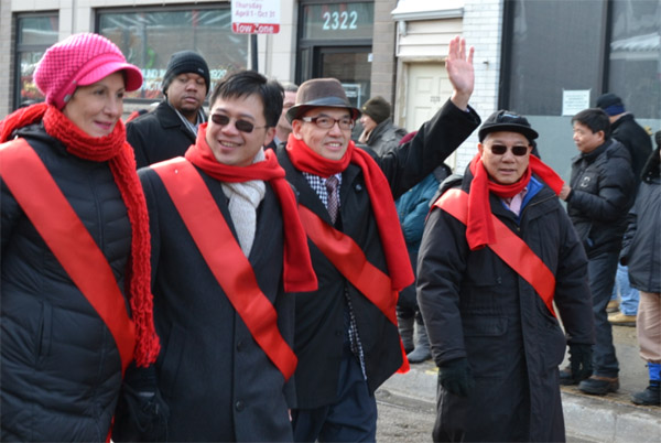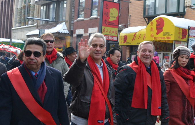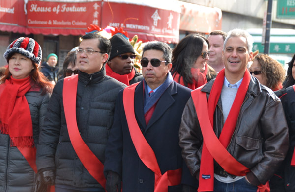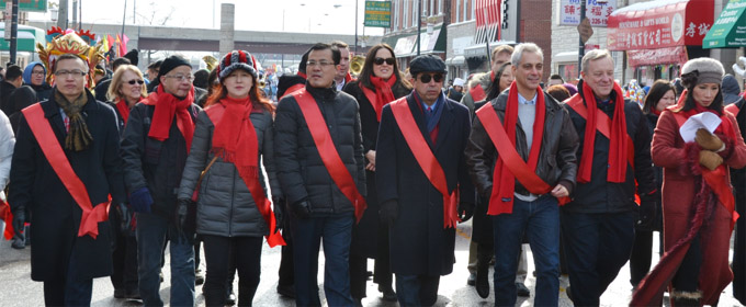 芝加哥侨学网报道】2014芝加哥中国城春节游行,2月2日圆满落幕。芝加哥市长伊曼纽(Rahm Emanuel)首次加入中国城春节游行队伍,沿途向民众挥手致意,恭贺马年新春。在芝加哥全城庆祝中国新年之际,伊曼纽市长表示将把中国新年打造成为芝加哥市的文化品牌,促进芝加哥旅游业发展,深化对华友好合作。两岸代表同台,主流嘉宾阵容强大,是马年新春游行的亮点之一。