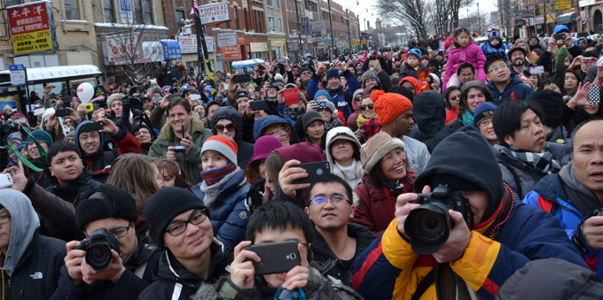 来自芝城协胜公会、龙冈亲义公所等传统侨团的老侨领,来自芝加哥各高中的鼓乐队,苏格兰风笛乐队,以及包括兴氏小学、圣德力学校、华德小学、希利小学等中国城区域的学校也参加游行,小朋友们拿着春联、提着花灯行进。游行现场,男女老少,各族裔人士喜气洋洋,老少同乐,共贺马年新春。