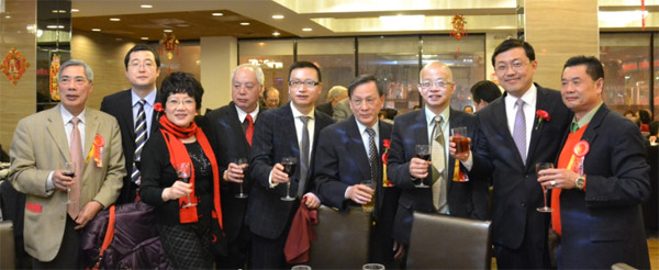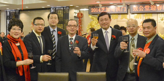 芝加哥侨学网报道】芝城洪门致公堂春宴日前在南华埠隆重举行,海峡两岸代表,协胜、安良、中华会馆、华联会等各界侨社友好欢聚一堂,共贺马年新春。洪门致公堂主席马森柱呼吁洪门兄弟们在新的一年中继续努力,为促进中美友谊,促进侨社繁荣团结再作贡献。