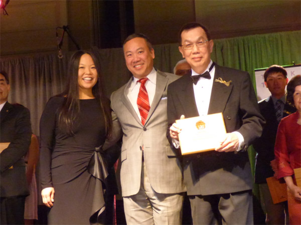 AACC 新年晚会,颁发“泛亚美谭继平纪念奖”予陈增华(右), 中为谭小平,左为AACC 主席梅根