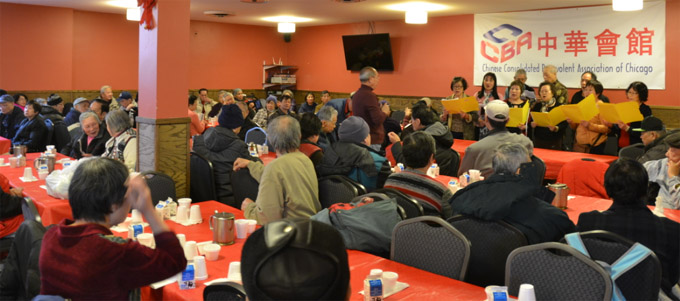 中华会馆职员与当季80岁以上的老寿星们合影,前排左四为刘国新主席,前排左三为来自芝加哥老人局的约翰索顿