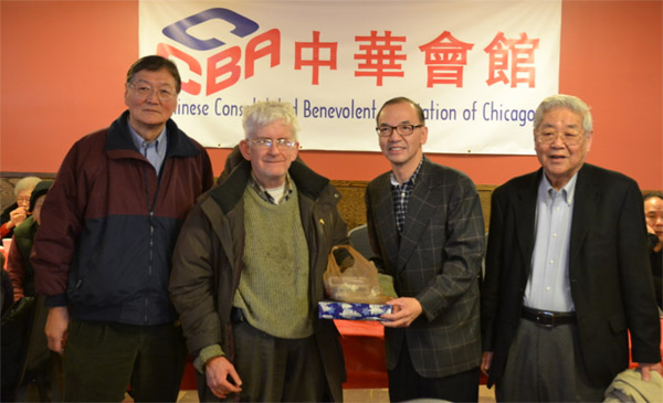 中华会馆主席刘国新、前董事长区一平、前主席黄景雄当天均出席庆生会,并祝福老人家们身体健康,祝福老寿星们寿比南山、福如东海。刘国新主席还特别向大家介绍了当天的特别寿星,来自芝加哥老人局的约翰索顿(John Thornton)先生,并向他赠送一份特别的生日礼物,感谢他多年来对华裔社区慈善事业的支持。