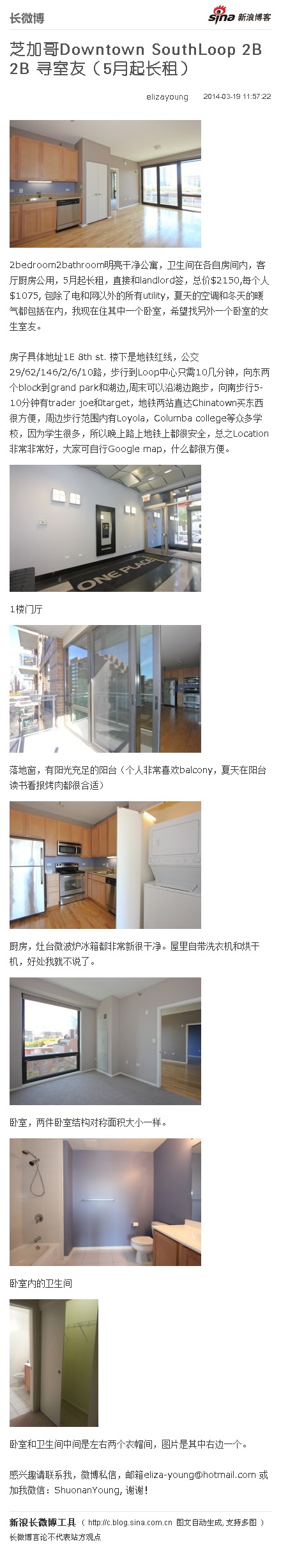 芝加哥Downtown SouthLoop 2B2B 寻室友(5月起长租)