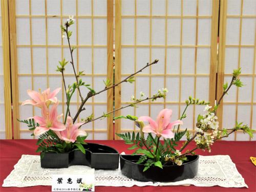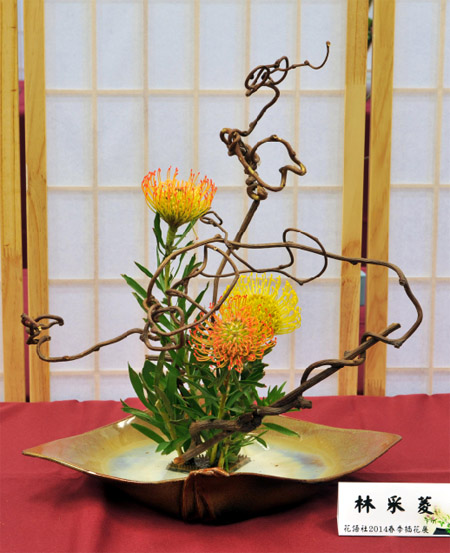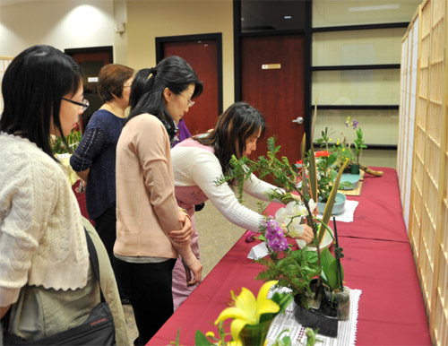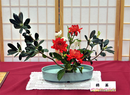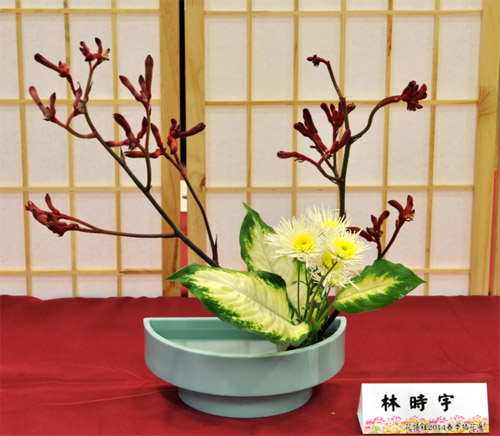 插花展由社长林芳合老师带领十馀位会员,经过数月的筹备,一共展示30 馀件精彩作品。展览第一天,芝加哥经济文化办事处葛葆萱处长莅临会场参观,他表示华人需要这样具有文化艺术特色的展览。 文教中心阎树荣主任及叶副主任也到场参观,同声称赞作品之美丽,也恭贺展出成功。两天展览期间下来,共有三百馀人次参加。许多参观者表示,会场佈置非常典雅,感觉非常温暖亲切;原色木质屏风,承现出高雅的背景及优异的质感;枣红色桌巾加上手工针织桌垫,适切的衬托出花型的美姿。