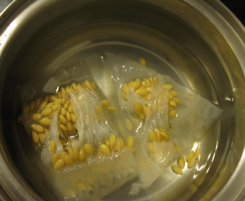 冬瓜瓤,加清水煮开了,凉了之后再喝,味道清新,略带甘甜,有清热解暑之效。简单容易做,大力推荐。