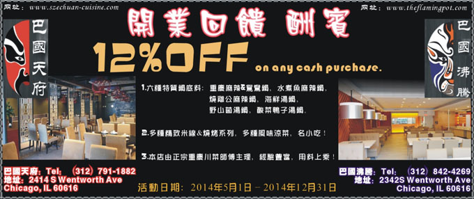 巴国沸腾,芝加哥正宗重庆火锅店,隆重试营业!开业酬宾,12%折扣优惠(即日起至2014年12月31日)!