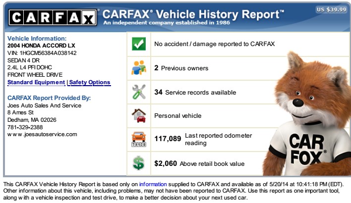 大家好 因为要回国了所以准备卖车 04年的 本田雅阁 4门 自动档 LX 里程11W812年底买入 之前只有一个owner 第一个车主维护的挺好的 记录在carfax上都有 我也是比较注意保护车的 定期换机油做保养 不抽烟车内无异味 一年半大概开了1万mile左右还另外装了一个pioneer200刀的音乐播放器 蓝牙usb和ipod pandora都支持 还有一个小话筒接在驾驶座左上方 方便开车的时候接电话 不需要再端着手机了 买车附送冬天扫雪必备装备 铲雪刷入手的时候是在一个比较大的Honda-dealer 入手价8500 现在kbb报价excellent价格是6400 very good是6000 我就取中间6200 OBO吧 [url=]CARFAX Price Adjustment™ 是正的2000多刀 所以绝对好车值价[/url]为方便大家 我买了carfax报告可以直接发送 要自己查也没问题 vin#是 1HGCM56384A038142如有兴趣请联系 qq173145255 phone OR message: 408-479-089零 邮箱stevenxu2014@gmail.com谢谢