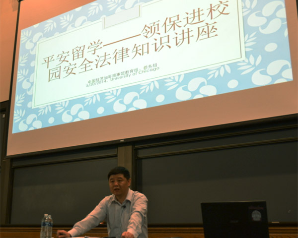 芝加哥侨学网报道】中国驻芝加哥总领事馆教育组、侨务组5月20日在芝加哥大学举行“平安留学 - 领事保护进校园安全讲座”讲座,负责领事保护工作的乔勇军领事回顾了中西部地区涉及中国留学生的治安事件、交通事故等案例,希望留学生们引以为鉴,保持基本的治安常识、了解美国当地的法律法规,平安留学,让国内亲友放心。