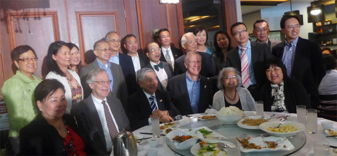 華商會會長陳偉民、老友聚餐館東主、亦為華聯會主席的胡曉軍向在座近百位華商會的成員、商家以及僑團領袖們介紹生於伊州,現年57歲、和妻子Diane 有六個孩子的伊州億萬富豪朗尼。 朗尼在今年2月初選中贏得共和黨州長候選人資格,將於今年11月4日,和現任民主黨的州長奎恩 ( Pat Quinn)爭奪伊州州長之寶座。