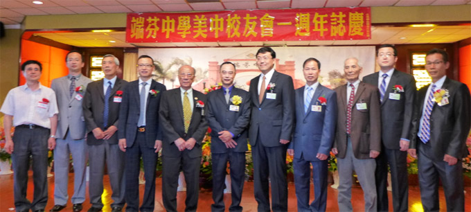 端芬中學校校友會一周年慶典,會長梅兆立(中)、理事長曹志恆(右一)與王永副總領事(右五)、汪興無(左一)及嘉賓們合影留念