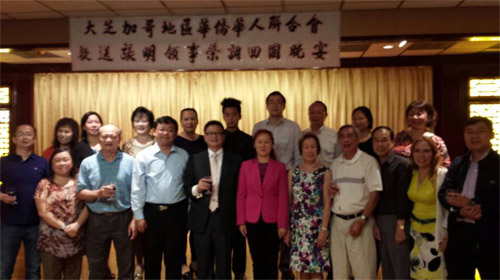 大芝加哥華僑華人聯合會17日在南華埠富麗華餐廳,為即將榮調澳洲服務的中國駐芝加哥總領事館簽證組領事張明,舉辦溫馨歡送餐會,華聯會名譽主席劉紅表示,平易近人、個性爽朗的張明,在芝服務期間敬業負責,對僑胞尤其盡心盡力,大家都對他離開芝城非常依依不捨。
