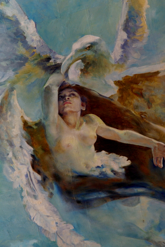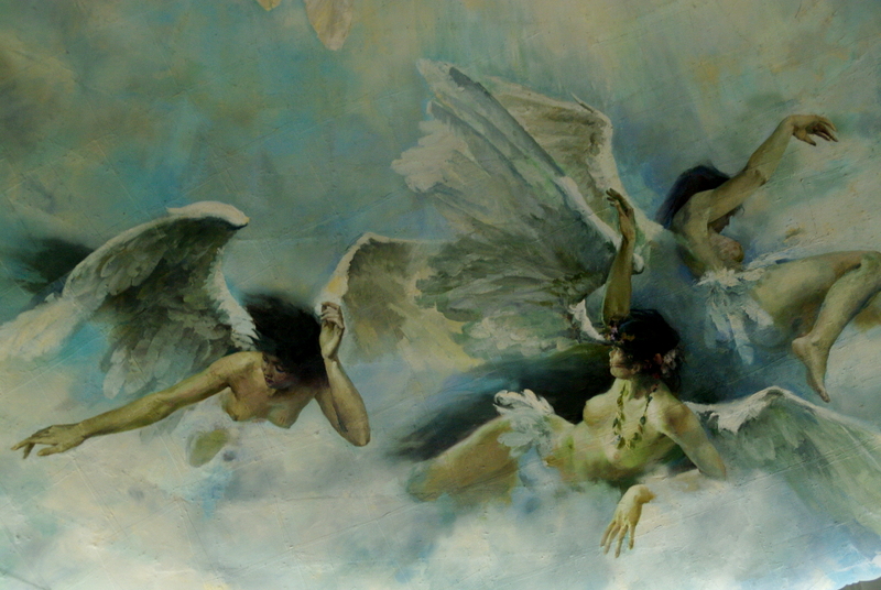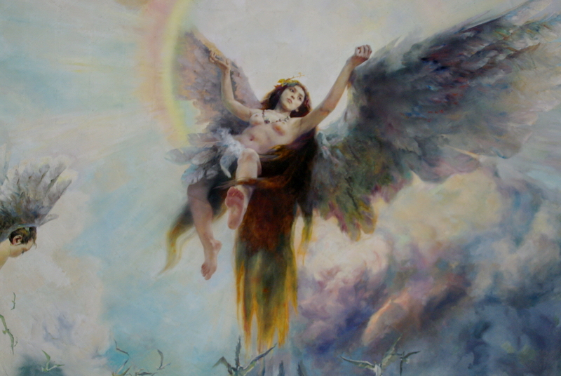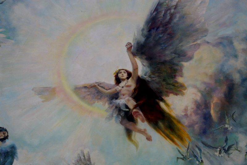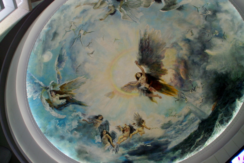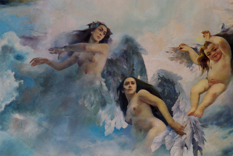 在天津原来的老火车站里,有一个像西方教堂式的拱式建筑。拱顶上的天花板有一幅壁画,画的是女蜗(女字旁)补天。站在拱底猛一抬头,看到这幅作品,真是十分震撼!画作美奂美仑,虽然是西洋画的风格,但是画上的女神们都是东方的模特。美得使人眼眩!大概我是个民粹,我始终认为全世界女人的胴体以中国为最美。特别是黑色的眉发,充满神秘感,是西方人所无法比拟的。现在的天津站已经摩登化了。在 2010 年的时候,这个拱式建筑还在,但是以后如何实在不敢说。我照了一些照片,限于技术及器材,也只能这样了。特此附上与摄友分享。