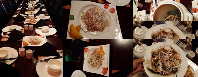 晚宴悬在当地的一台湾同胞开的中餐馆。 一进门,就看到顾客都是此起彼伏的金发碧眼,还以为是到了一家美国化的中餐馆。可到预定的桌席一看,有凉拌西洋参丝、萝卜丝、西洋参炖肉汤,都已经就位,从不辣,到很辣,依次排列。老板是生于杭州的台湾同胞,相同的语言,在异国他乡倍感亲切。大厨是来自沈阳的哥们,作完菜特意出来敬了一圈酒。
