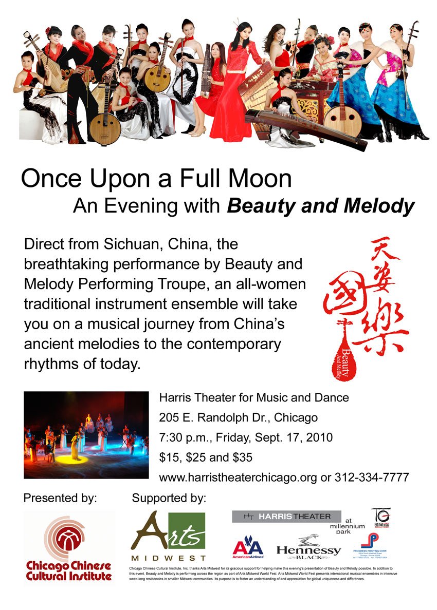 2010年9月17日,星期五,晚七点半,芝加哥中国文化学院与美国中西部艺术协会合作,在市中心哈里斯大剧场举行四川省天姿国乐女子民乐团庆中秋访问演出。天姿国乐团是应美国中西部艺术协会邀请来美国中西部巡演的。她们为芝加哥的华人华侨以及老乡们带来了家乡的祝福和精彩的民乐表演。希望广大华人华侨踊跃参加。了解演出详情或购买