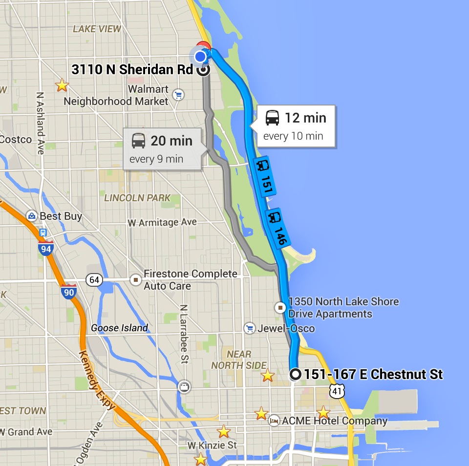 去downtown的话走一个block(5分钟)就可以到达express公交站 上了公交之后直接走lake shore到downtown/water tower(5-10分钟左右,中间不会停靠其它站点 所以只用坐一站)
