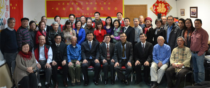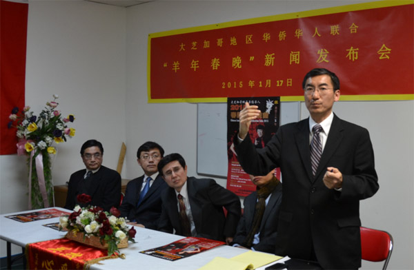 芝加哥侨学网报道】大芝加哥华侨华人联合会(华联会)1月17日举办“羊年春晚”新闻发布会,华联会主席汪兴无,春晚筹委会总干事王涛呼吁大芝加哥各侨团、社区商家、侨学各界人士积极支持本届春晚,共襄盛举。筹委会各工作部门负责人当天也汇报了工作进展。