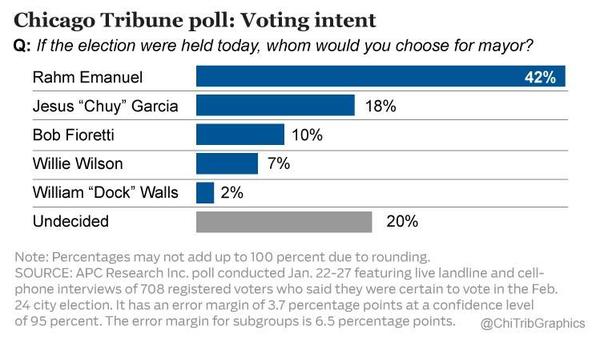 据《芝加哥论坛报》最近公布的最新民意测试,现任市长伊曼纽市长的支持率领先其他四位挑战者。伊曼纽的支持率为42%,加西亚的支持率为18%,菲奥瑞提为10%,威利威尔逊7%,威廉沃斯仅获2%。在各族裔社区中,现任市长伊曼纽的支持率也遥遥领先。在拉丁裔/西语裔社区,伊曼纽为40%,而加西亚只有23%,菲奥瑞提为18%。在非裔社区,伊曼纽支持率为40%,加西亚为14%,菲奥瑞提为13%。在白人社区,伊曼纽的支持率最高,为49%。