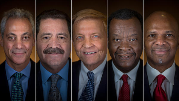 芝加哥市长五位候选人,左起:Rahm Emanuel (现任市长), Jesus "Chuy" Garcia ( 库克郡专员 ), Ald. Bob Fioretti(芝加哥第二区区长), Willie Wilson (医药用品企业家), William "Dock" Walls (社会活动家,曾多次参选芝加哥市长)