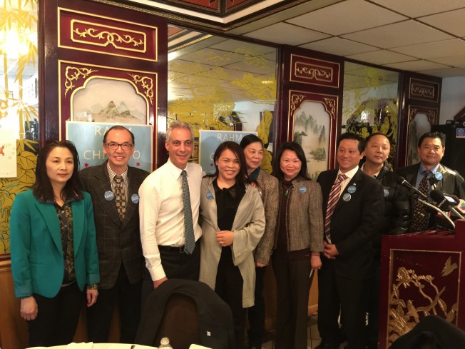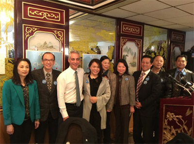 尋求連任的芝加哥市長伊曼紐(左三),13日到北華埠富麗華餐廳,爭取亞裔選民支持