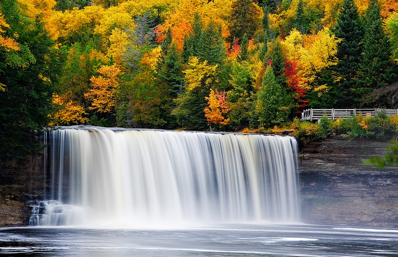 野猪山森林公园(Porcupine Mountains Wilderness State Park),由于地处北部密西根州顶端区域,气温下降较早,每年也是红叶高峰期首先到来的区域之一。沿着公园主干道 South Boundary Road一路向前, 路两边的浓浓秋意尽收眼底. 沿途在Summit Peak登塔眺望远方, 秋日的壮丽会让你不虚此行。野猪山公园的另一看点便是瀑布,开车至主干道尽头的Presque Isle River, 数条瀑布或笔直倾流而下,或蜿蜒展转缓缓而流, 动静结合令人贪恋美景不舍离去。