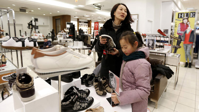 2015年2月,“到芝加哥过大年”的中国游客,在市中心密西根达到的水塔购物中心选购商品