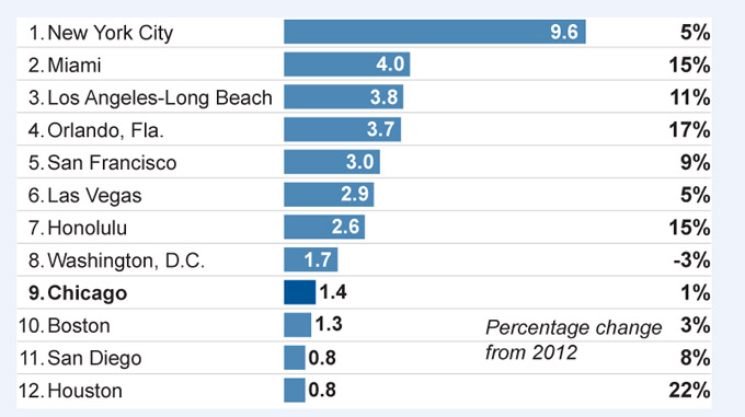 2013年,芝加哥市吸引的中国游客总人次约为12.8万,比2012年增长15.3%,而同期全美中国游客的增长率率则为22.5%。2013年,芝加哥市的墨西哥游客增长仅1.4%,共约14.4万人,而同期全美增长水平为4.7%。唯一可以欣慰的是,同期加拿大游客5%的增长率,领先全美3%的增长率。2013年芝加哥市共吸引55.1万加拿大游客。