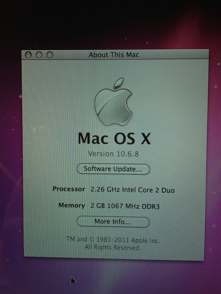产品参数:2GB RAM, 500GB硬盘内存。CD player, 2.25GHZ, Intel Core 2 Duo Processor. OS X 10.6.8 (问过苹果公司,确保可以升级到最新版本的 OS X Yosemite)。很适合做设计的朋友们使用这台电脑。想哈看更多关于本产品的参数,请登录苹果官方网站查看: