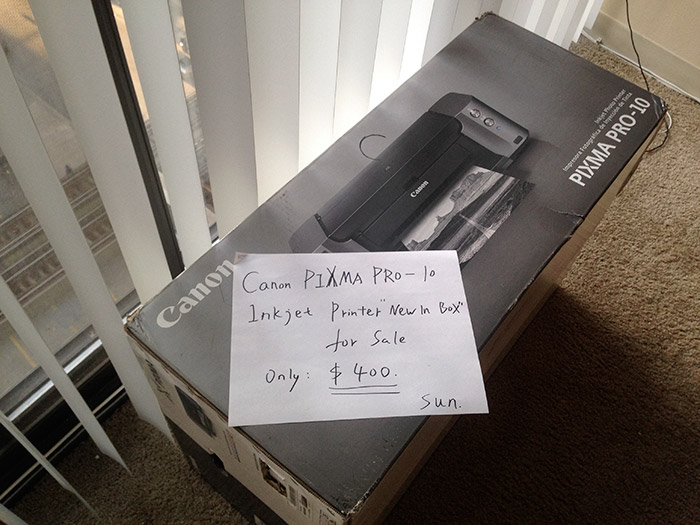 本人现有一台全新未开封Canon PIXMA Pro-10专业喷墨打印机,是今年初买相机大套装包含的。由于本人已经有类似的打印机,现想超低价出售。原价$699,现价$400。如果有意购买,价格可以再议。有意者可加微信:sunnowitzki 或致电312-841-8774