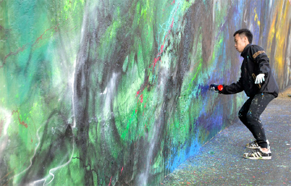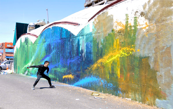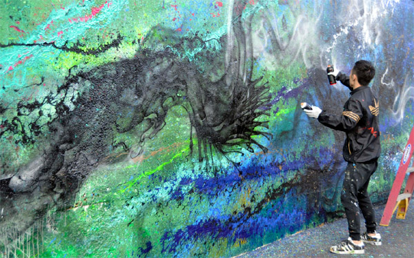 【芝加哥侨学网讯】來自中國佛山的街頭藝術家陈英杰出(艺名:画图男),日前利用在中国城百佳超市外牆的完成了巨型創作《龙游四季走天下》。画图男以噴漆、潑灑顏料等方式,展現不同色系顏色特點,以及顏料噴灑自然流瀉的痕跡,在120呎x10呎的大型外牆上表現出春夏秋冬四季,一條潑墨長龍貫穿其中,描繪出龍走四季、龍走天下的主題,讓人見識到他獨特的藝術表現方式。