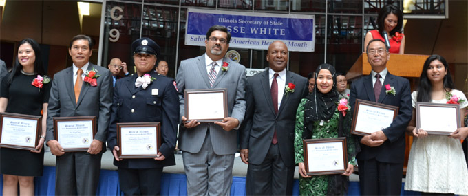 华裔社区杰出工商业主赵培业(左二)等“亚裔社区杰出人士”奖得主与州务卿Jesse White 合影
