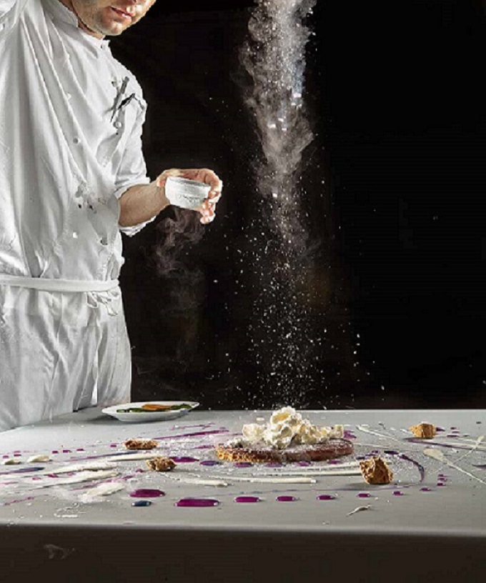 该餐厅的特色更在于独特的就餐体验就餐的同时还能欣赏到厨师们精湛的演示表演,每道菜都如艺术品一般被厨师们逐一变出,展现在你的面前。视觉体验也非常值得一提。比如食品的摆放与陈设,比如将皇帝蟹蟹肉、海胆、剃刀贝放在包裹着新鲜海带叶的树桩,让客人体验海鲜味。又比如“冬季梦幻”的一道菜,雪松枝、棉花糖、雪营造冬日体验,暗红糖浆,热巧克力,橙片、果冻、鲜绿的香草叶等带来鲜明的色彩对比。
