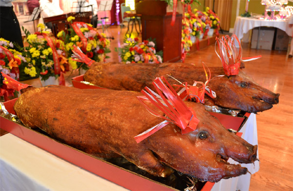 喜庆聚会,社区联欢中的“人气王”,是怎么制作而成的呢?皇上皇店主马森柱,曾在2012年8月于中国城华埠广场的华埠嘉年华活动上,为公众表演炭火烤乳猪的绝活。华洋观众目睹约25分钟烤制全过程,大呼过瘾。