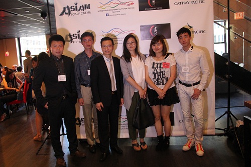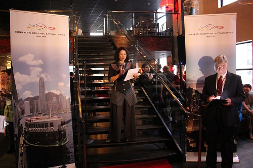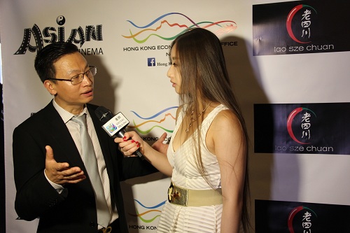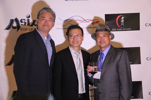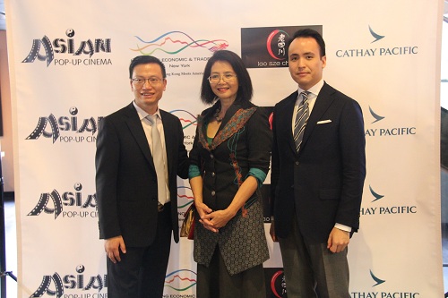 芝加哥亚洲国际电影节创始人王晓菲女士(中)、香港驻纽约经济贸易办事处副处长关可临(右)、老四川东主胡晓军(左)等嘉宾出席开幕式