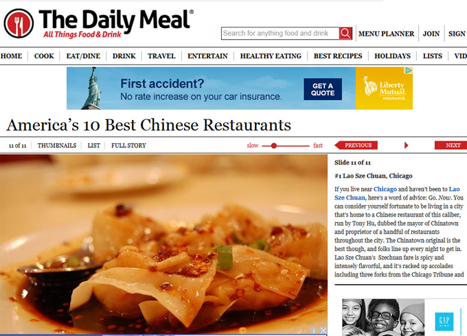 该网站表示,口味最接近中国原汁原味的美国中餐馆,其实也不难找,而且大部分都集中在东西海岸大部分华人移民落脚安居的城市。该网站以“可谓最正宗,最接近中餐原汁原味”为主要考察标准,以及参选中餐馆在当地的知名度与受欢迎程度等因素,通过全美及地方性印刷媒体、网络媒体美食报道调研;实地考察;咨询当地美食评论专家以及该网站自身的厨师团队,最终排定“全美最佳中餐馆前十强”的座次,芝加哥的老四川餐厅位居全美第一。