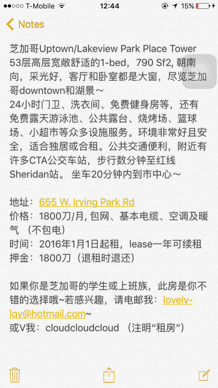 芝加哥Lakeview以北一室一厅一卫招租。2016年1月1日起租,长租一年。53层超豪华景观,朝向南,户型宽敞舒适,环境好且安全,适合独居或合租。24小时doorman和gym。楼里有洗衣房和dryer,有guest parking。公共交通便利,8分钟步行到红线Sheridan,坐车20分钟之内到市中心。