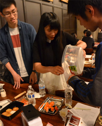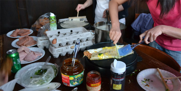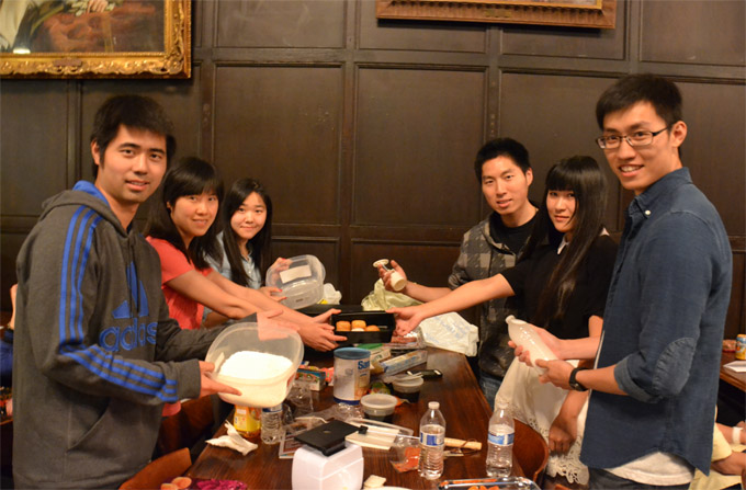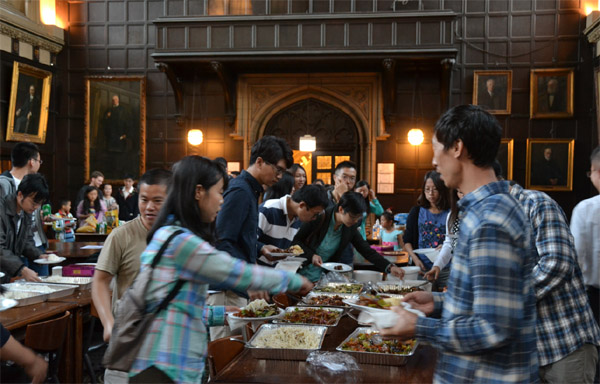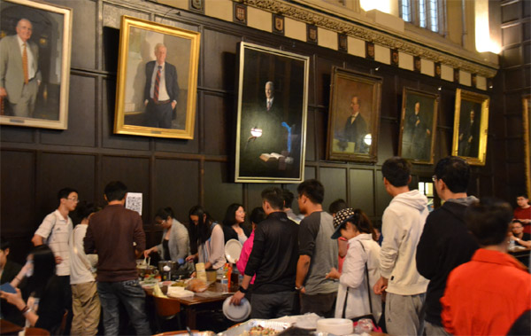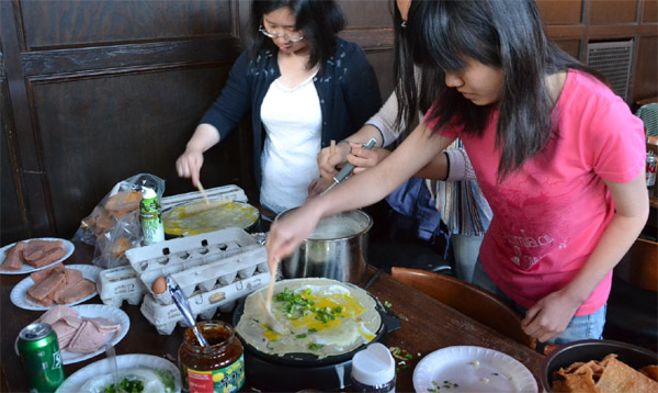 在挂满芝加哥大学学术名人画像的大厅内,中国留学生欢聚一堂。当天人气最爆的,当属现场烙煎饼果子。在学生会的安排下,从亚马逊上买到烙饼神器摆上桌,韩国甜酱、中国辣酱、美国面粉,热狗,火腿肉片,鸡蛋,葱花,还有同学们自己炸制的酥脆饼片一字排开,俨然一个街头煎饼小摊。从排队等候的长龙来看,这种融合世界各国原料的煎饼果子备受欢迎。