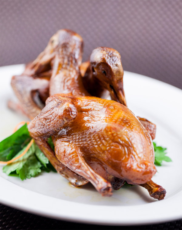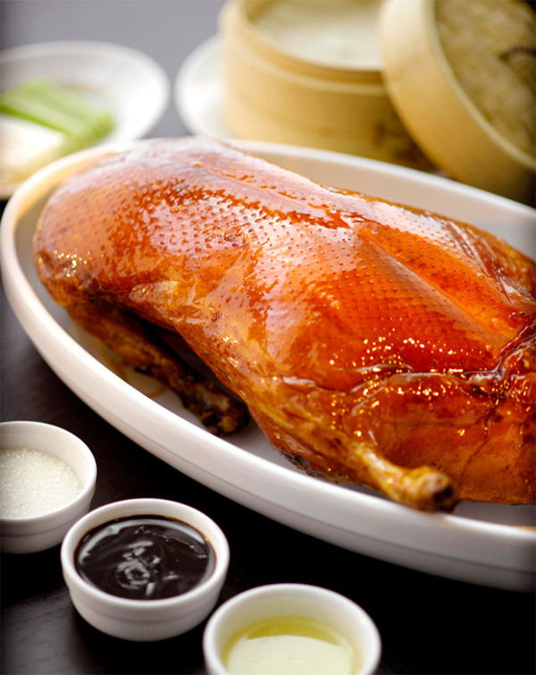 (一只两食,每桌限一只。额外$5则可一只三吃,片皮、炒丝外加美味鸭架汤)。